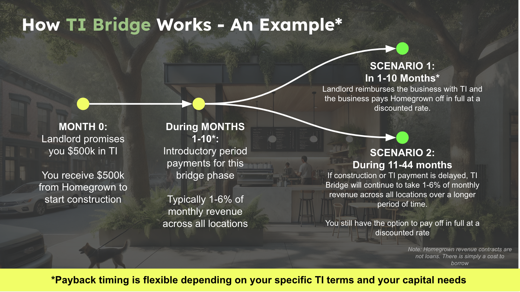 Once construction is complete, the operator pays Homegrown back with TI Reimbursement funds from their landlord
