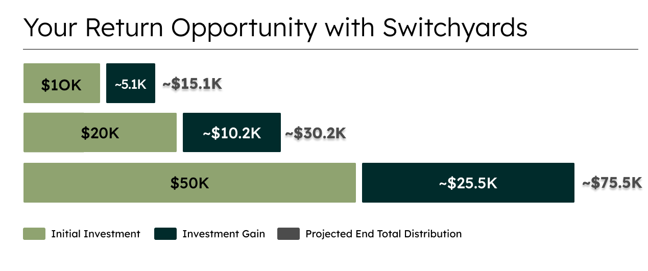 - Assumptions: The projections made by this calculator are based on the assumption that 1% of Switchyards' monthly net revenue will meet or exceed the monthly payments on the distribution schedule. Actual results may vary.